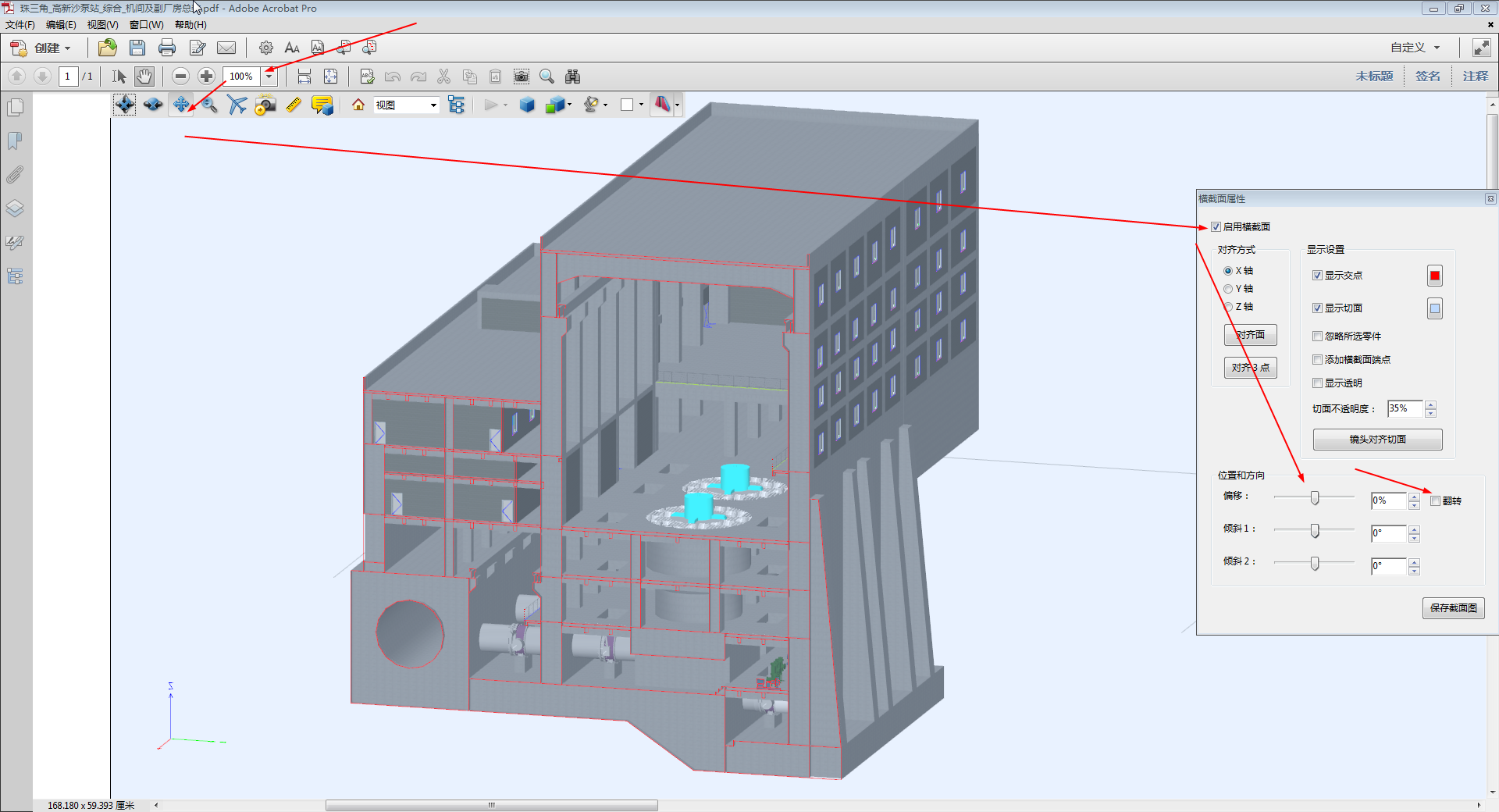 具体操作见下图:实际上就是窗口嵌套,pdf窗口里嵌套了三维图纸窗口,后者又可以放大缩小旋转和剖切。而整个三维图纸的窗口还是受pdf窗口的操作来控制。