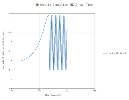 分析时长先按500s。50s直线关阀,管道高程20m,静水位32.24m,压力12.24m,水锤水位42m,压力升高10m,超过50%。