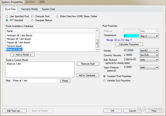 选择AFT Standard里面的1大气压下的水的model,输入温度21摄氏度,软件自动计算处其他参数。可以看到,Standard库里面还有许多其他的model。注意,在这个版本的impulse里面,需要使用者必须输入的数据都经过高亮处理,还是十分方便的,当然这个设置也可以自己取消。