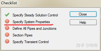 impulse这个软件和MATLAB里面的simulink很类似,原理上都是仿真,使用方法都是将工具栏里面的元件拖拽到工作空间区域,然后设置好元件的基础参数。但是由于不同流体的基本属性对会拥有不同的流动过程,所以第一步还是要设置好流体参数。点击上图的小对勾,弹出checklist对话框,impulse中完成一个系统的建模需要5项准备工作,分别是定义稳态控制,定义流体系统属性,定义所有管路与节点,管长歩段的选取以及定义瞬态控制。如下图所示,该对话框可以检测这5项准备工作是否完成好,完成的项目前面会显示对勾,如果均完成,即可运行。一般第一项定义稳态控制是系统默认完成的。鼠标点击这个惊叹号的标题,就可以直接跳转到对应的设置里。