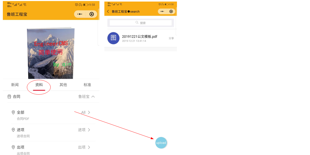 进入资料页——进入某个目录——上传资料——选择微信中的资料,暂时无法选择手机中的资料。