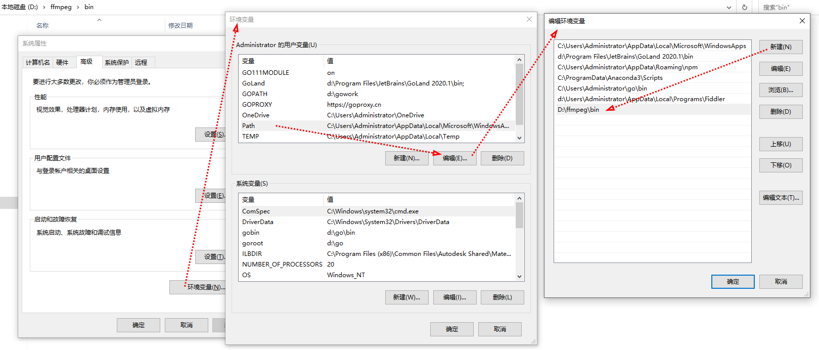 下载解压后就能在 bin 文件夹下看到三个可执行程序:ffmpeg、ffplay、ffprobe,配置好环境变量后即可使用:环境变量——用户变量——path——编辑——新建……。