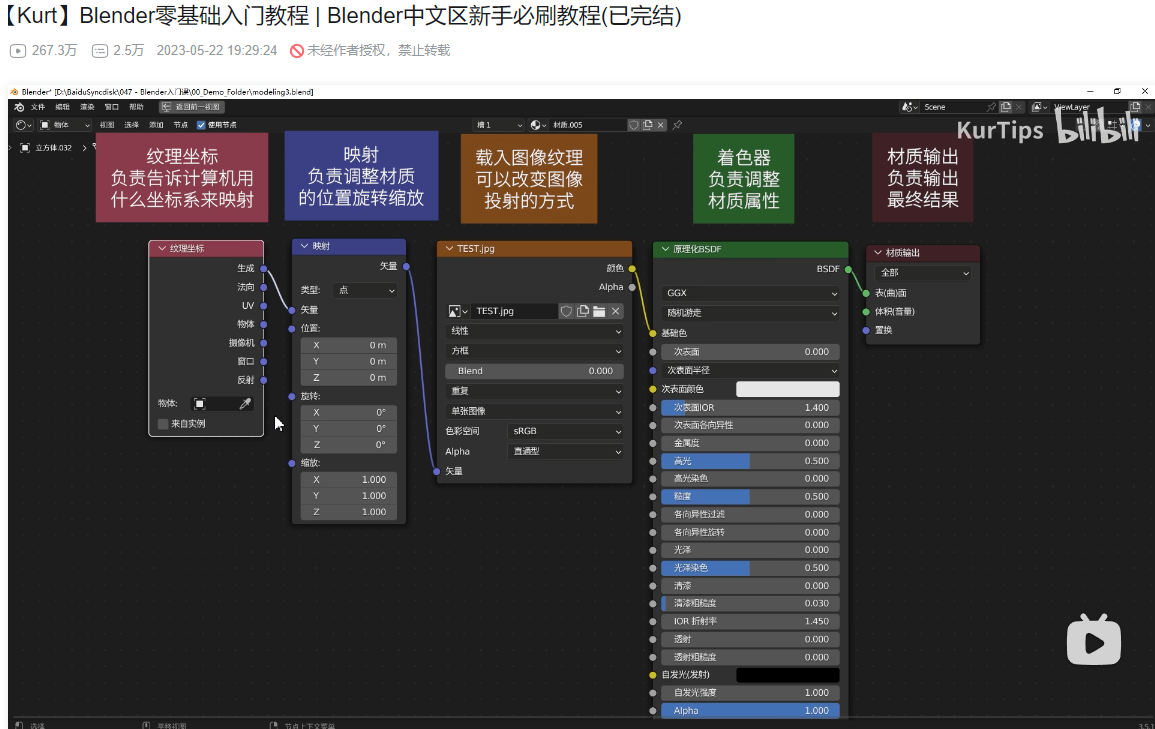 blend教学只需要看第3篇:材质 部分即可,因为新手对于blender这种bsdf的节点法材质处理方式很陌生,看一眼就会了。