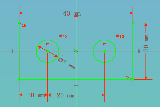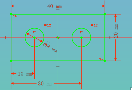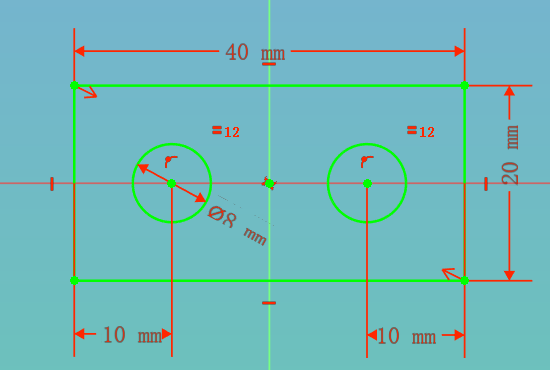 下图所示是在草图中采用不同设计思路的示例。如果矩形板长度40mm 发生改变,会如何影响整个几何体?第1张所示草图中,无论矩形板的尺寸40mm 如何变化,两个孔始终与边界保持 10mm的相应距离;第2张所示草图中,两个孔以矩形左侧为基准进行标注,尺寸标注将使孔相对于矩形板的左侧定位,孔的位置不受矩形板整体长度(40mm)的影响;第3张所示草图中标注了孔与矩形板边线的距离以及两个孔的中心距,这样的标注方法将保证两孔中心之间的距离。