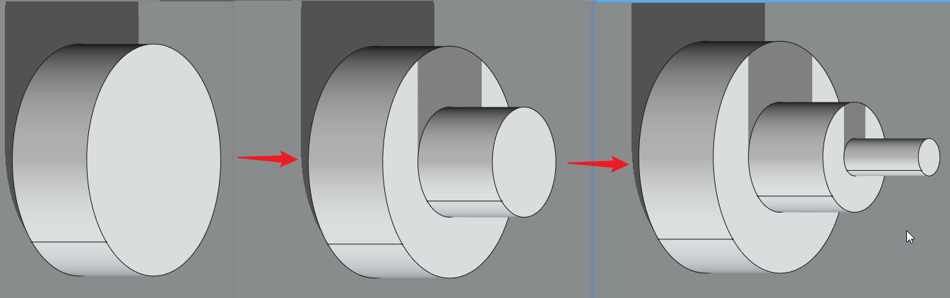 - 1.3.3 制造法——制造法是通过模拟零件加工时的方法来建模的,如下图所示。例如,当阶梯轴在车床上生产时,在设计上可以考虑从一根棒料开始建模,并通过一系列的切割来去除多余的材料。