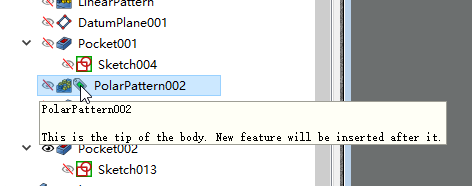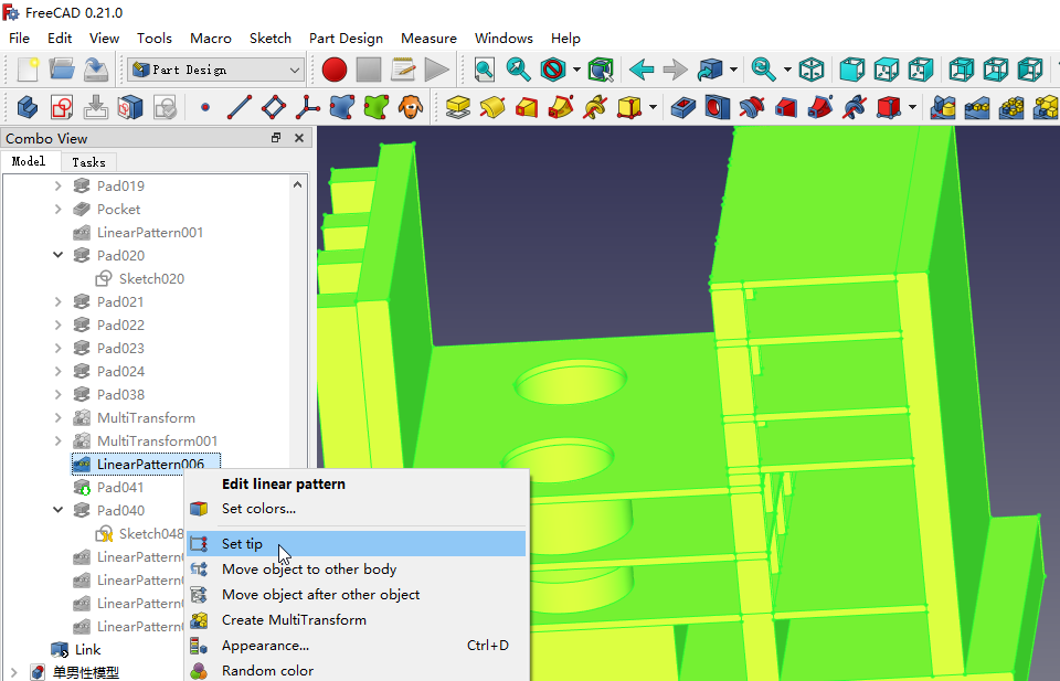 如下图所示,pad040出错,原因是它依赖的面被删掉了。于是我在linearpattern006位置 设置计算位置
