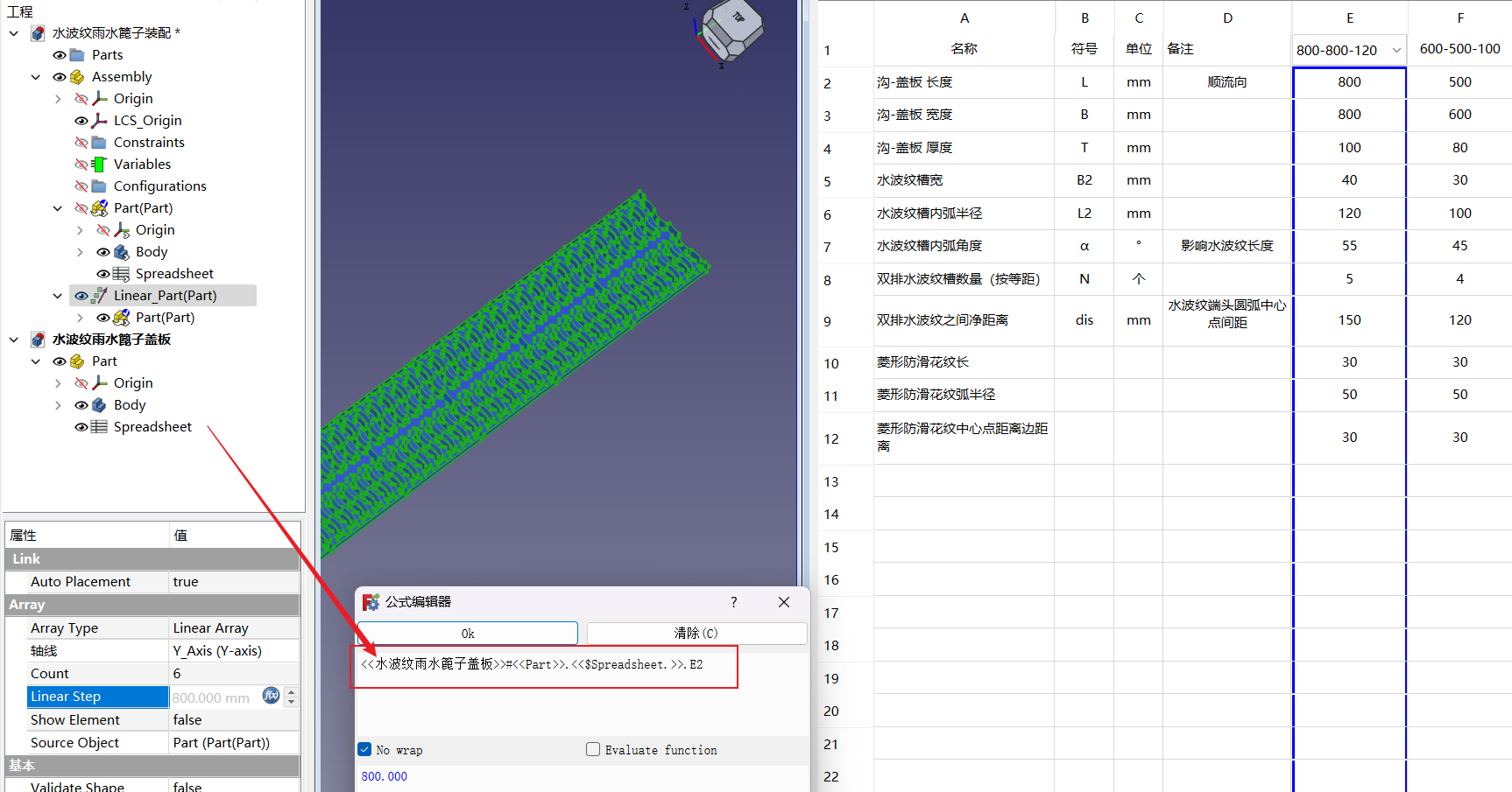 或者装配体直接引用子模型的特征参数,例如下图中的装配体中的阵列步长,引用了来自子模型的表格里E2单元格数值<<水波纹雨水篦子盖板>>#<<Part>>.<<$Spreadsheet.>>.E2: