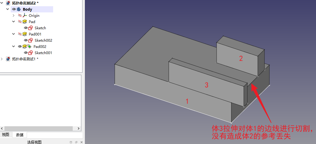 这是因为体3的草绘发生在体2后。如果发生在体2前,则不会。
