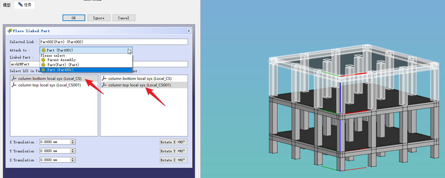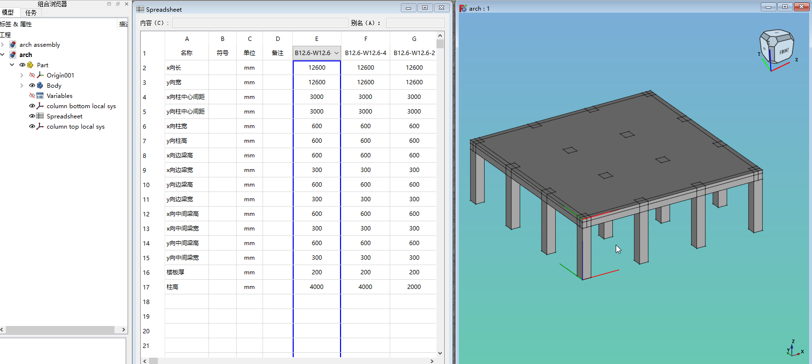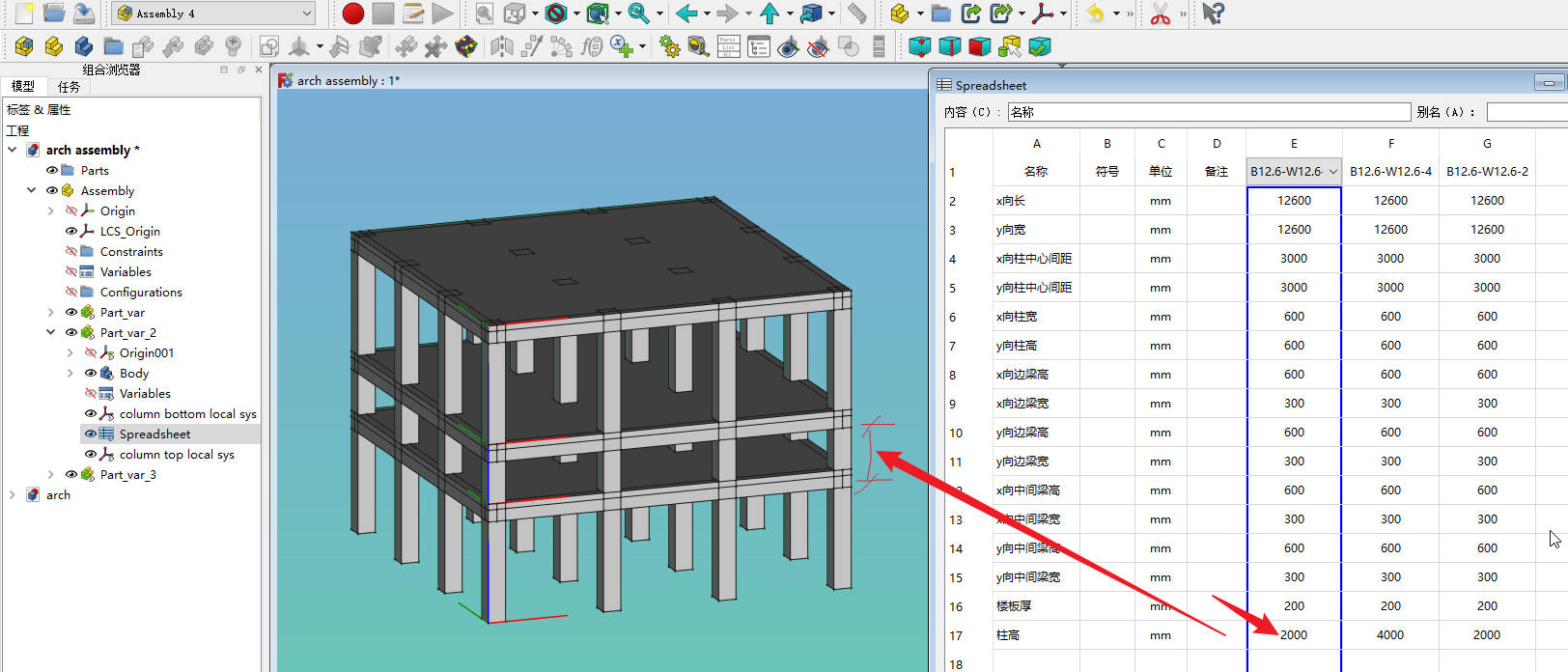 我建议单体文件里绘制轴网(当然,不画轴网也没事),绘制一层楼板,考虑到有些情况下,第一层地面是没有结构的,所以我们绘制的单体应该是楼板、梁加上 下方的柱子,然后到装配体里,多次插入这个单体,关键是要用到知识点“变体参数”(就是在单体里插入Variables,到A4里用create variant part),每个插入的单体可以对应不同参数组。例如层高是3m的,对应柱长度是3m的那组参数;层高是4m的,对应的柱长是4m的那组参数,屋面层的楼板比较薄,则对应薄楼板那组参数。
