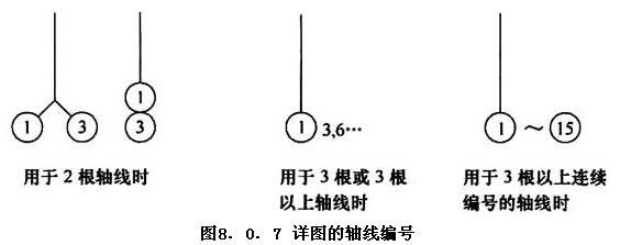 8.0.6 两根轴线的附加轴线,应以分母表示前一轴线的编号,分子表示附加轴线的编号。编号宜用阿拉伯数字顺序编写,如: 1.jpg表示2号轴线之后附加的第一根轴线; 2.jpg表示C号轴线之后附加的第三根轴线。 1号轴线或A号轴线之前的附加轴线的分母应以01或0A表示,如: 3.jpg表示1号轴线之前附加的第一根轴线; 4.jpg表示A号轴线之前附加的第三根轴线。8.0.7 一个详图适用于几根轴线时,应同时注明各有关轴线的编号(图8.0.7)。