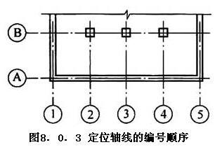 8.0.3 除较复杂需采用分区编号或圆形、折线形外,平面图上定位轴线的编号,宜标注在图样的下方及左侧,或在图样的四面标注。横向编号应用阿拉伯数字,从左至右顺序编写;竖向编号应用大写英文字母,从下至上顺序编写(图8.0.3)。