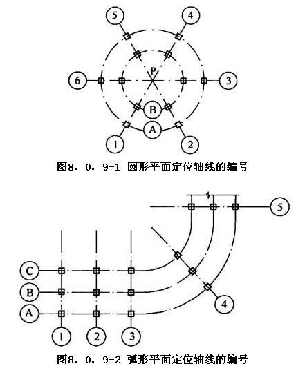 8.0.10 本条为折线形平面图中定位轴线的编号示例,但没有规定具体的编号方法,可参照例图灵活处理。更复杂的平面如何编号,还有待从实际中总结归纳。FC轴网规定