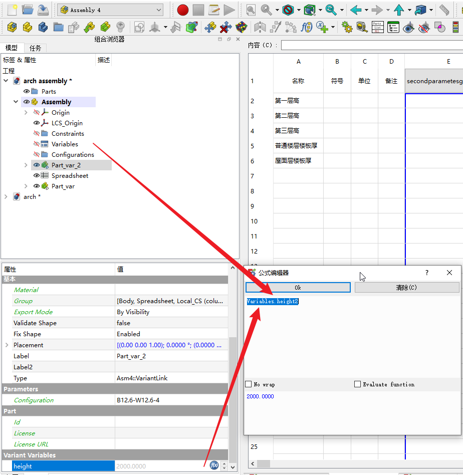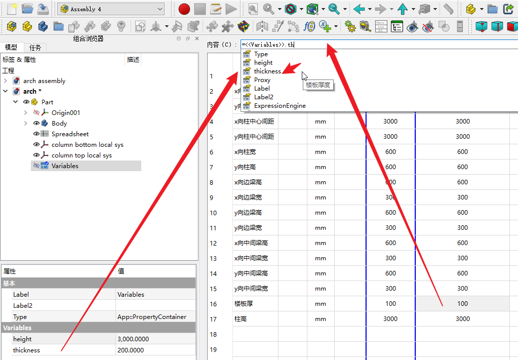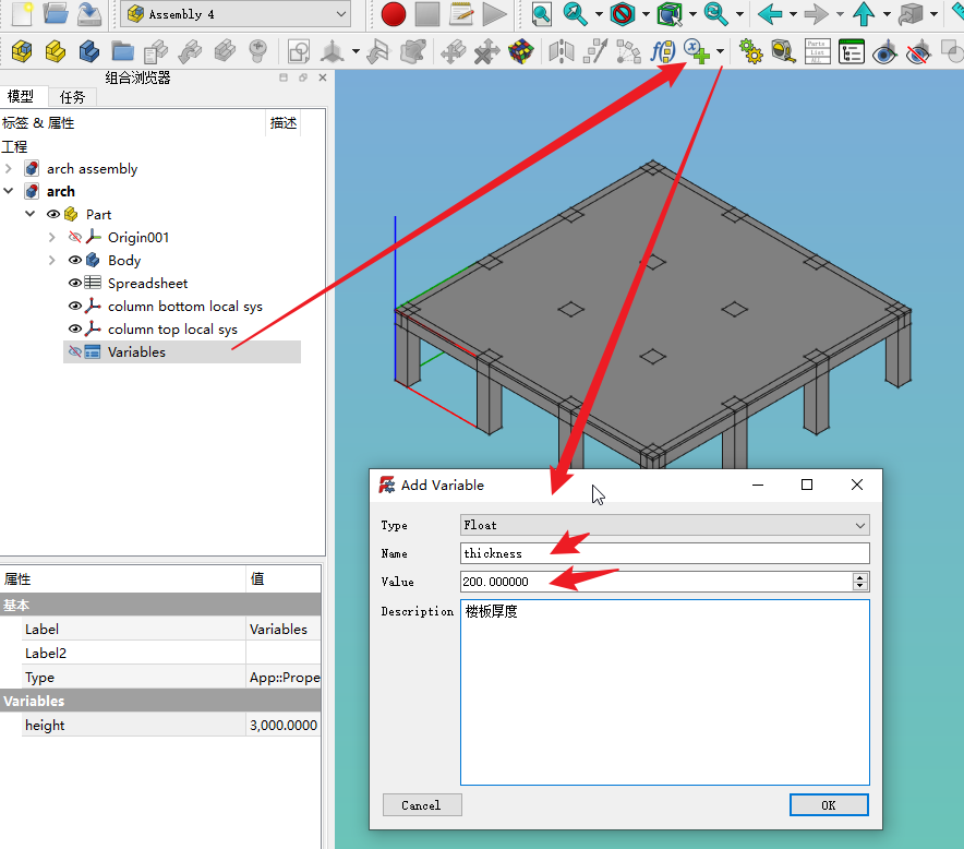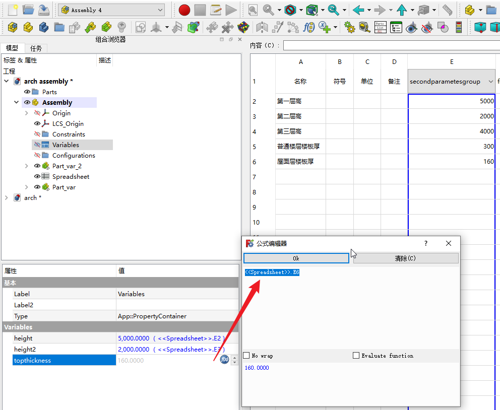 那么到单体零件中,我们在variables定义一个thickness和楼层高度height的2个变量名称,value随便选一个接近的数即可,不用纠结。