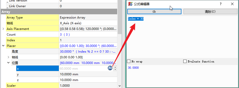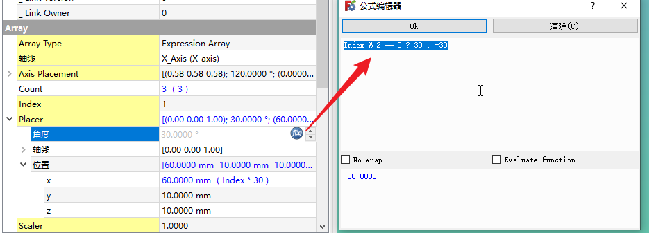 下列表达式意思是,索引除以2如果余数为0,则逆时针旋转30°,否则顺时针旋转30°。也就是区分索引是奇数偶数的意思。