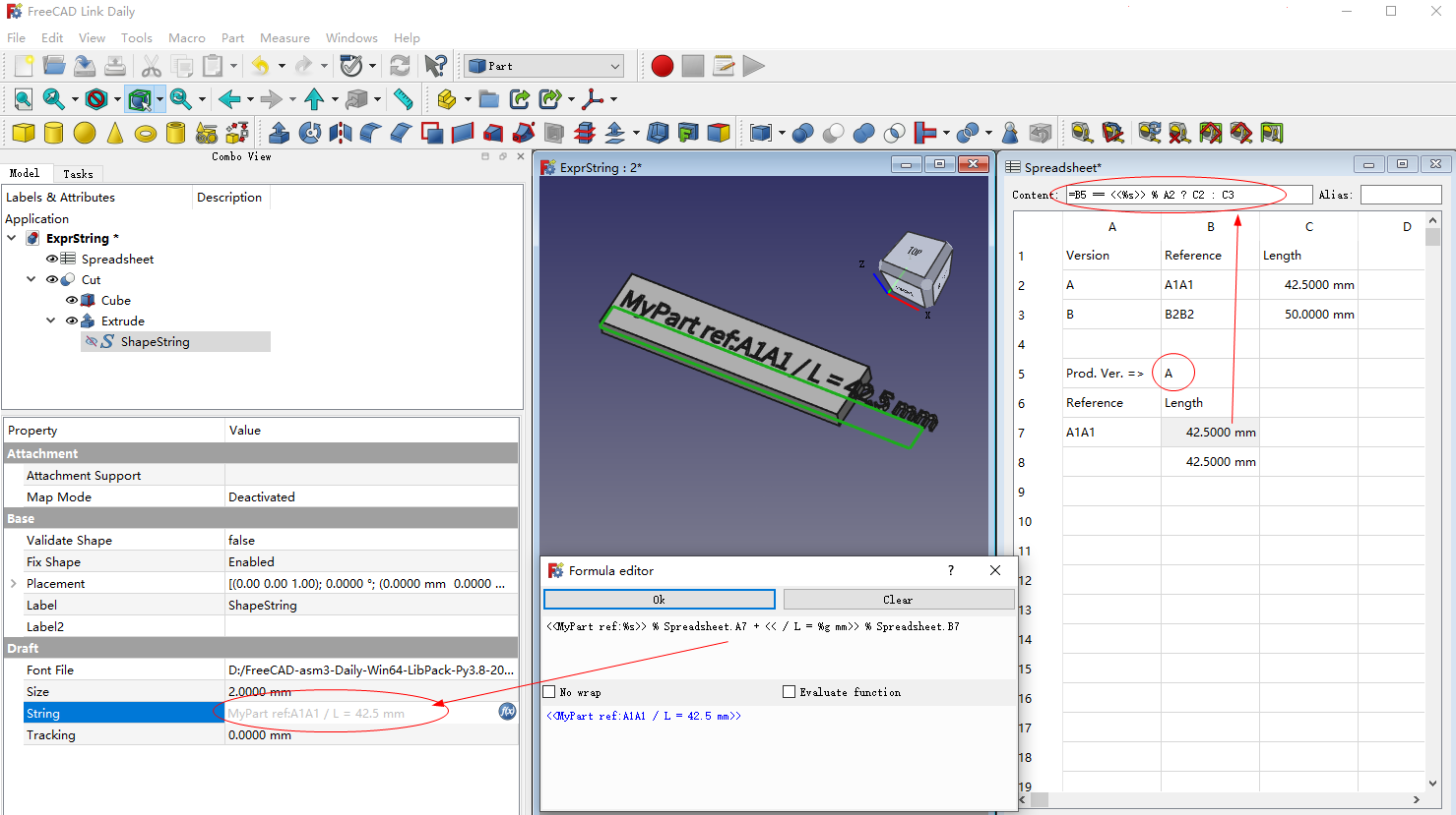 再来看模型里的参数表达式<<MyPart ref:%s>> % Spreadsheet.A7 + << / L = %g mm>> % Spreadsheet.B7