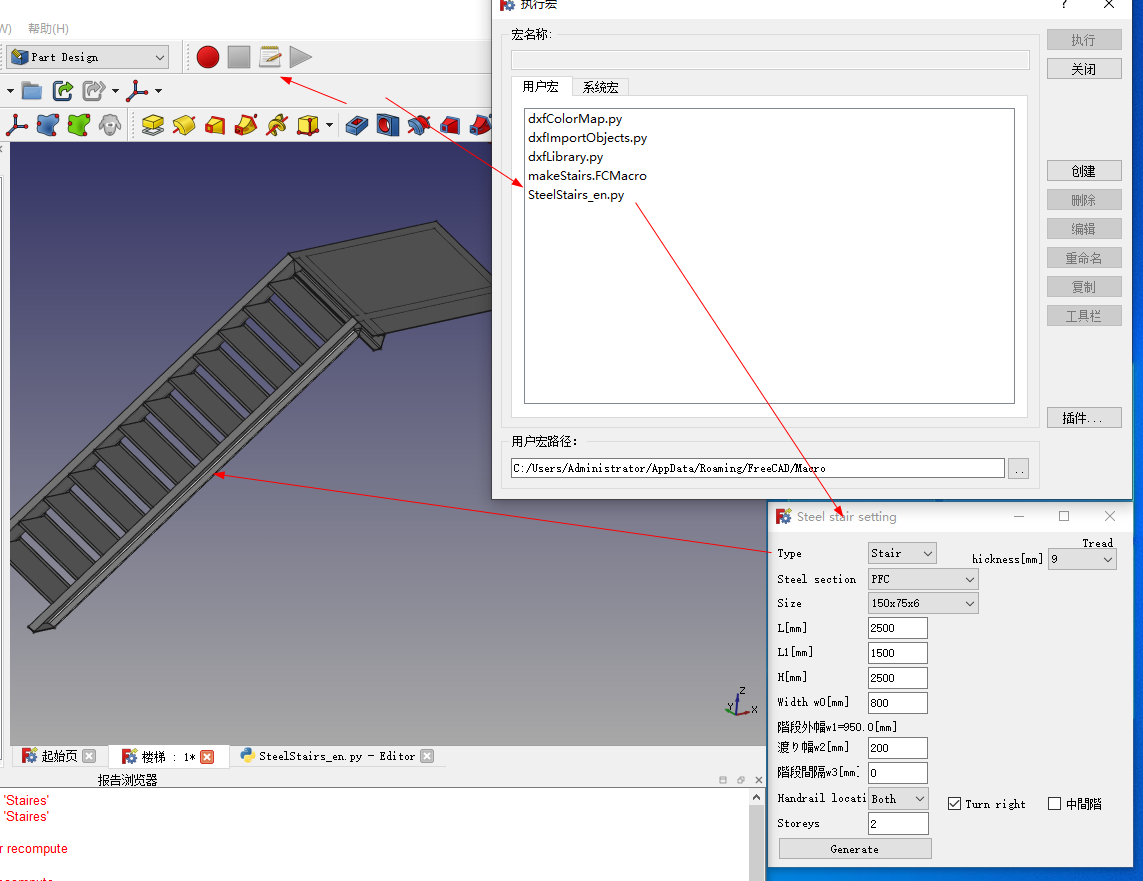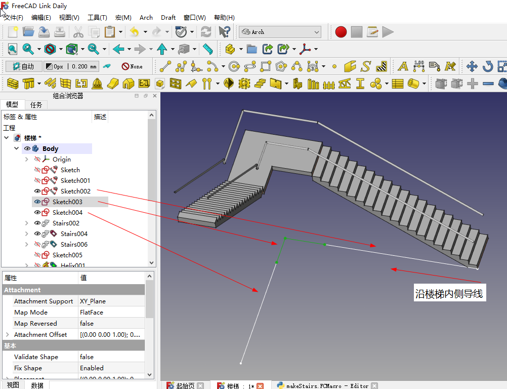 先在xy平面中绘制草图,草图中绘制多段线,直线和圆弧,或纯圆弧,回到模型,草图处于选中状态,运行这个makeStairs.FCMacro宏