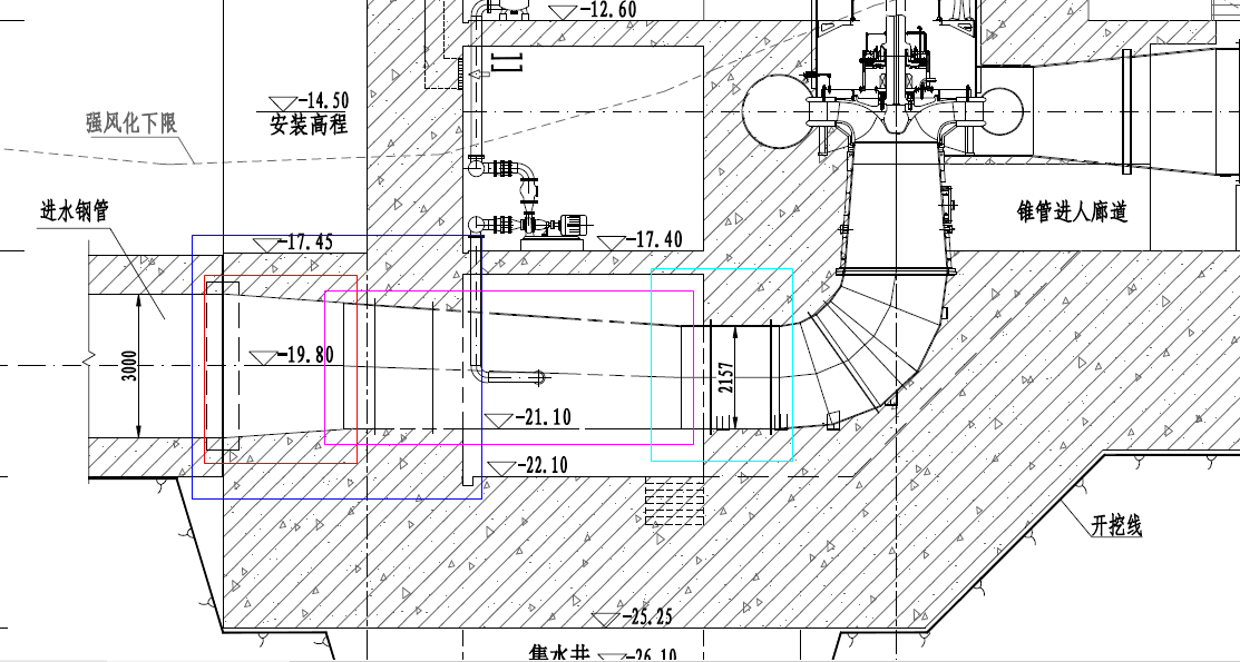 上图从左到右,红色线框中是标准的对称的锥管,粉色是下方水平的锥管,但它一半在砼中,一半是明管,实际上有点麻烦,按上面的砼中减料,明管增料的原则,挺难一次建成。
