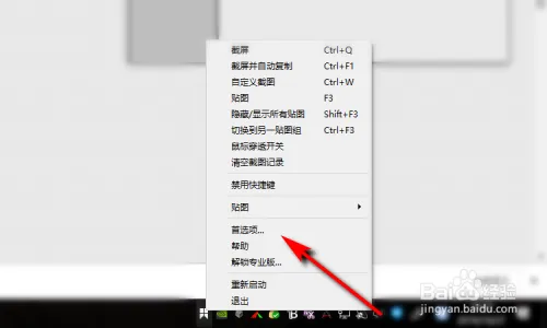 首先,右键找到电脑上的右下角对应的snipaste小图标,右键点击,弹出菜单。点击首选项