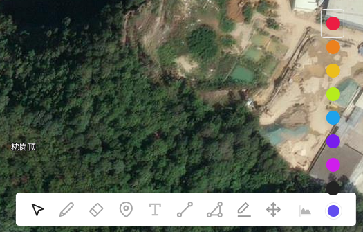 line)、多边形(polygon)、矩形(rectangle)、圆形(circle)、标记(marker)、文字(text)等;编辑方面支持删除(eraser)、编辑顶点(拖动、增、删)、移动(drag)、旋转(rotate)、偏移(offset);切剖面(暂不完善)。数据存在服务端数据库中,将地址分享给伙伴,协作或展示。 - 比较常用的场景就是用户在cad里布置好线路,通过转换后(方法),将线路导入mapus,(如果存在坐标转换偏差,根据遥感图上的地物,稍微移动一下图形),可以编辑线路上的顶点:删除或拖曳顶点位置。