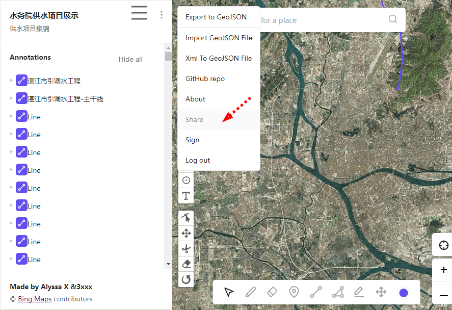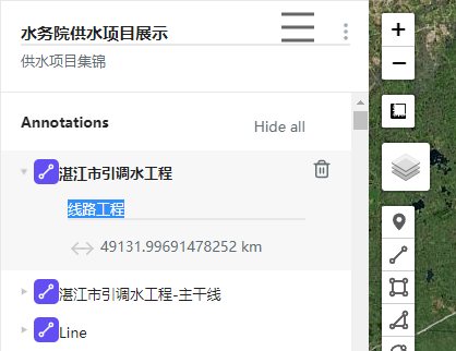 导入后可以再编辑左侧导航栏中的图元名称和描述。{ "type": "FeatureCollection", "name": "北江引水——这里是工程名称", "features": [ { "type": "Feature", "properties": { "Layer": "主干线——这里是图层1名称", "Name": "主干线——这里是图层1名称", "description": "这里是特性描述,比如流量,洞径等", "PaperSpace": null, "SubClasses": "AcDbEntity:AcDb3dPolyline", "Linetype": "Continuous", "EntityHandle": "D4", "Text": null }, "geometry": { "type": "Point", "coordinates": [112.59549, 23.89696] } }, { "type": "Feature", "properties": { "Layer": "分干线——这里是图层2名称", "PaperSpace": null, "SubClasses": "AcDbEntity:AcDb3dPolyline", "Linetype": "Continuous", "EntityHandle": "D4", "Text": null }, "geometry": { "type": "LineString", "coordinates": [ [113.151798, 23.66315], [113.151801, 23.66311] ] } }] }5 修改图元(图层)名称和描述