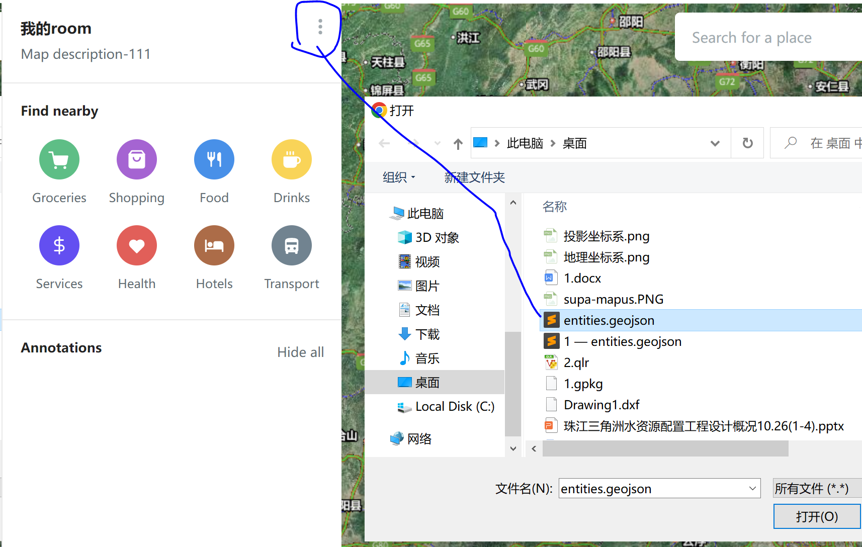 }找到import geojson,选择刚刚在QGIS中导出的geojson文件即可。导入后可以编辑左侧导航栏里的名称和描述。