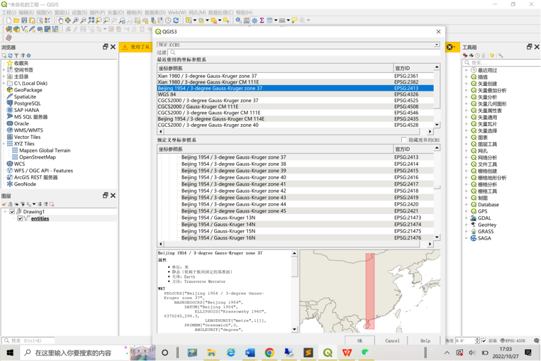 右键选中图层——设置CRS坐标系统,这里就是cad里所使用的平面坐标系了。所谓的投影坐标系,注意横坐标前面的2个数字,是37的话,就在下图中选对应的zone37。设置完图形会消失,点第5个放大镜图标(缩放到图层)即可显示。