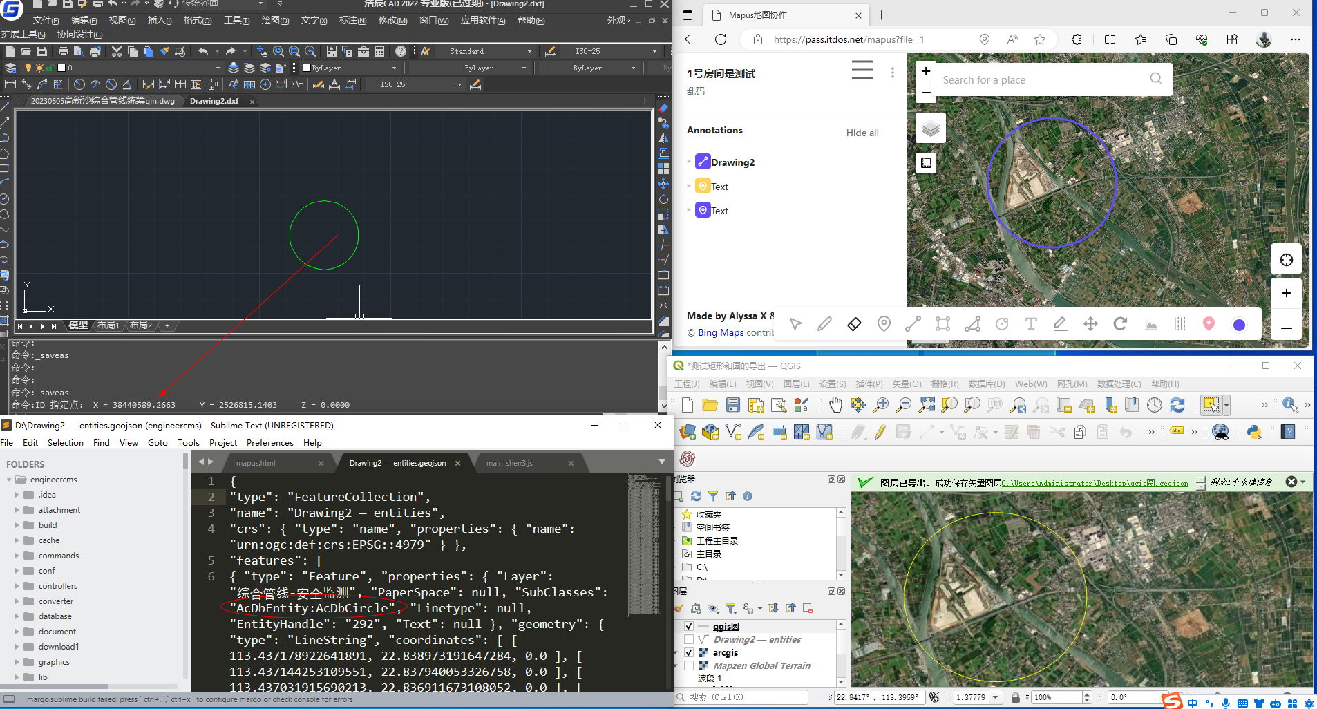 cad中在对应的完整坐标位置绘制圆,拖入qgis,再用qgis的bulk vector export插件导出geojson格式,导入go-mapus
