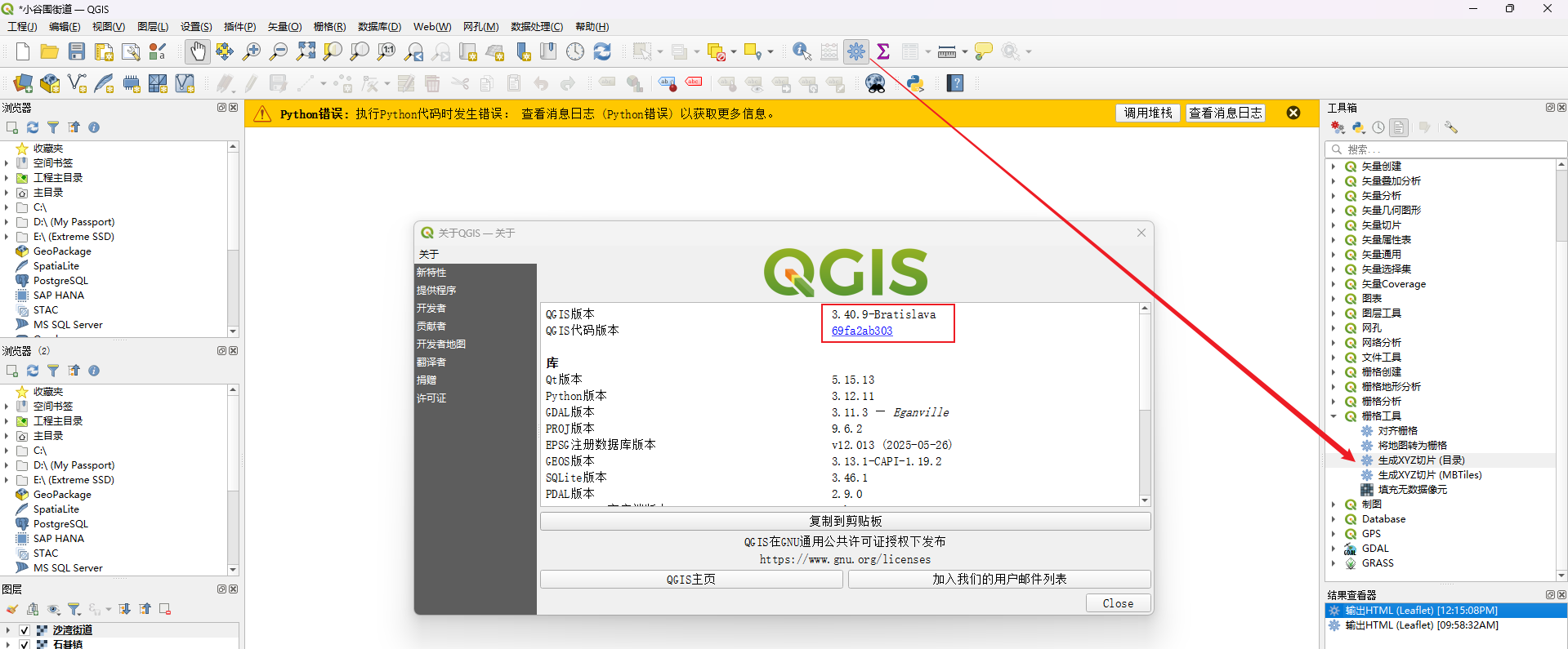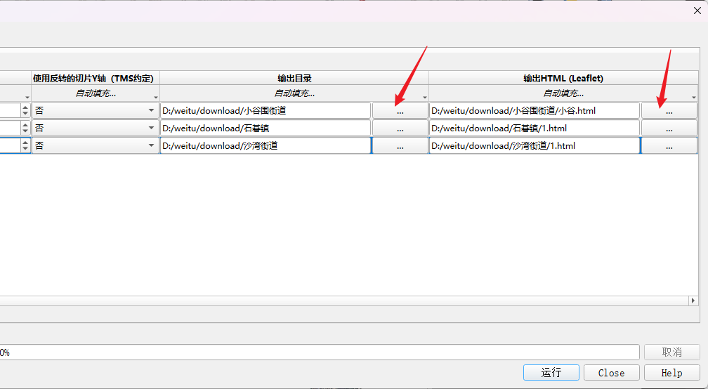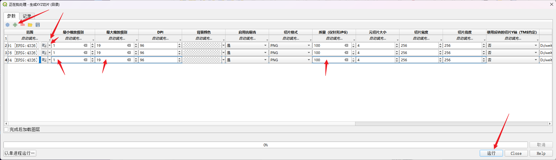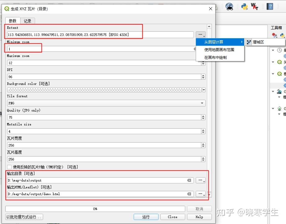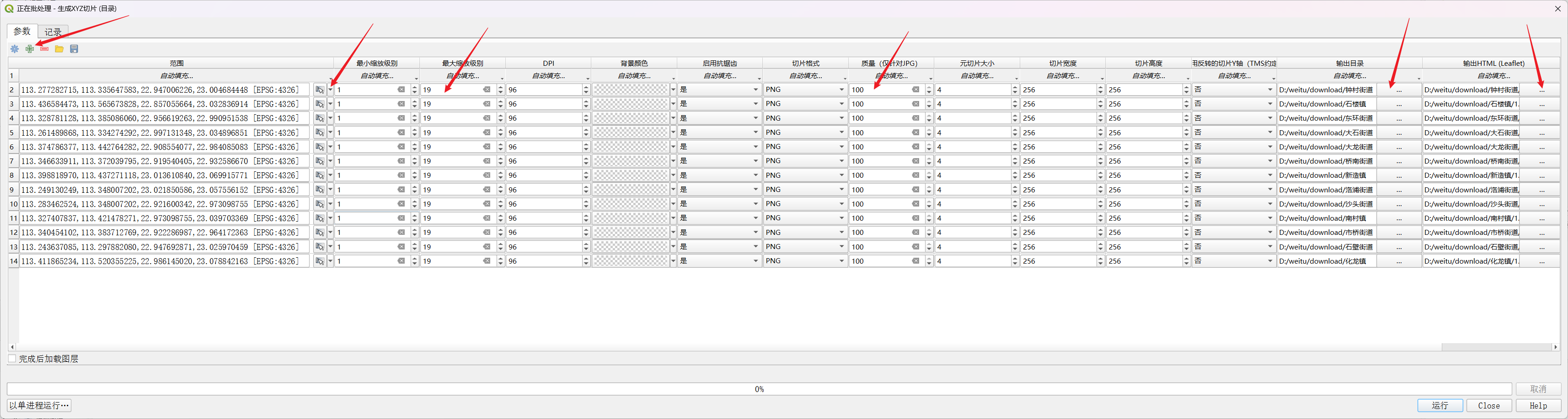 当我们把所有镇街tif拖入到QGIS里后,可以将它们作为一个整体切割xyz瓦片导出到一个目录中。