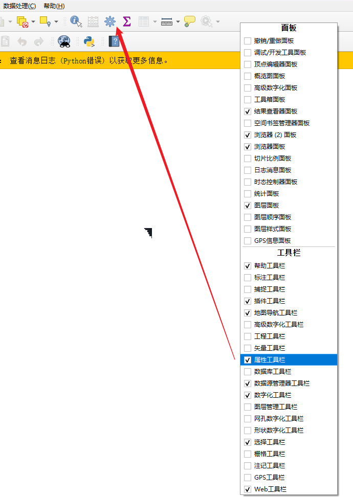 新版QGIS:面板上右键,勾选”属性工具栏“——然后按下“工具箱”