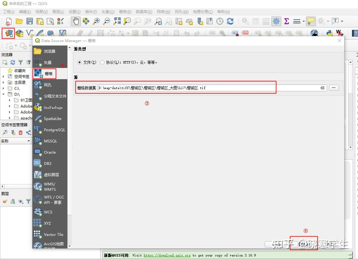 点击 “栅格”——选择要切片的卫星照片(tiff格式),地图的高清卫星照片可以在 Bigemap 、水经注等软件下载。