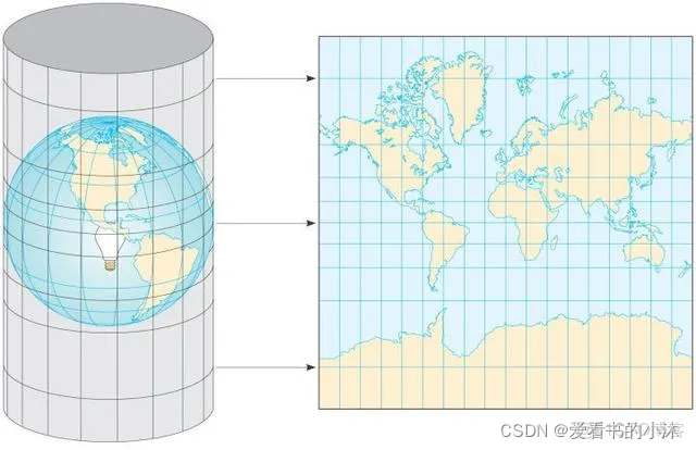 用一张纸卷成圆柱,围住地球仪;然后在地球仪的球心放一个发光的灯泡,地球仪上的地图会在圆柱纸上形成投影;把这张纸平展开,就是我们常见平面世界地图。上面所讲的投影法叫墨卡托投影(Mercator Projection)。