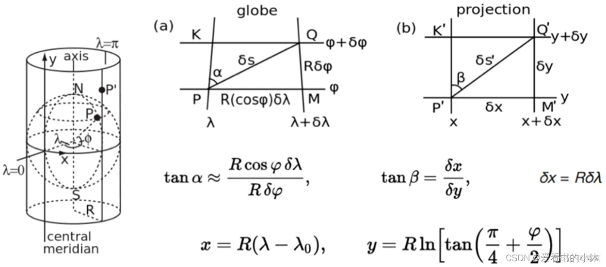 地图学是一门严谨的科学,需要数学模型和精确的公式计算,再做近似处理,墨卡托投影数学模型如下: