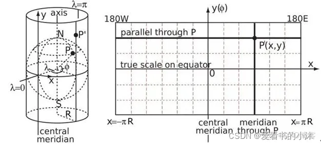 地理坐标系是三维的,我们要在地图或者屏幕上显示就需要转化为二维,这被称为投影(Map projection)。显而易见的是,从三维到二维的转化,必然会导致变形和失真,失真是不可避免的。常用的投影有等矩矩形投影(Platte Carre)和墨卡托投影(Mercator)。