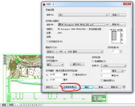 对1#布局进行手动打印,目的是为后面自动打印设置好打印参数如打印机、颜色、纸张、打印范围等。设置完后点cad打印设置“应用到布局”。