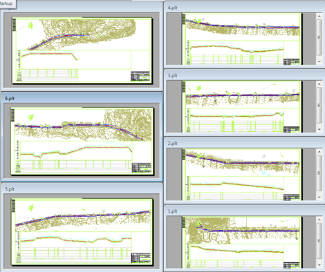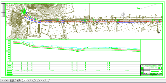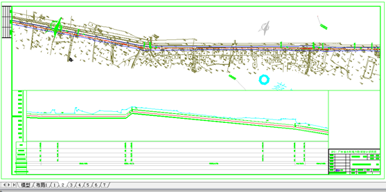 按照提示选择cad中平面管道中心线、纵面管道中心线、0高程基点、表格下端线。裁图测试先生成3个布局,效果见下图:如果符合要求,则删除刚刚生成的布局,重新点击“布局裁图”进行全部裁图。