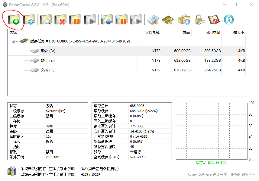 我启用 PrimoCache 再看看读写速度:达到了 17630.38MB/s、20977.84MB/s。
