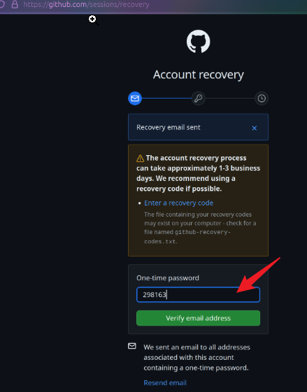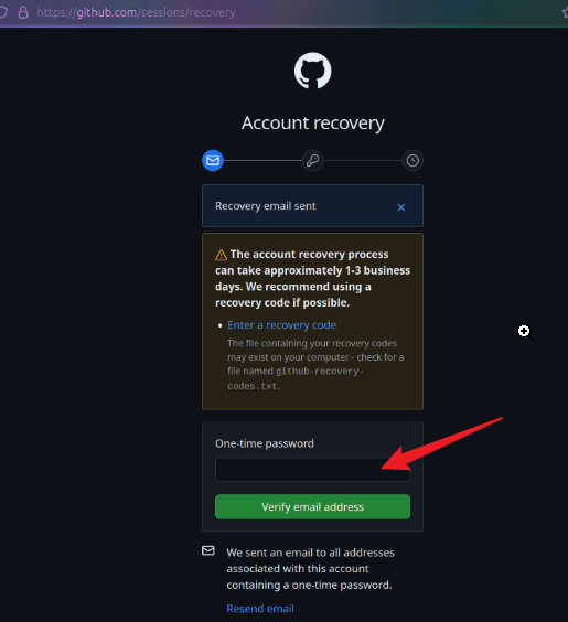 点击绿色的Send one-time password按钮,向github账号绑定地邮箱发送验证码