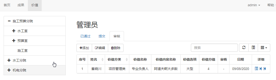 管理员登录后,看到的界面是所有部门,右侧界面切换到审核标签页,这里有等待审核的价值列表。点击详细进行查阅,然后通过审核。