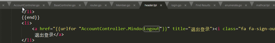 直接改header.tpl里的urlfor(位于conf——enumerate.go)后面的urlfor "AccountController.Logout"为urlfor "AccountController.MindocLogout",