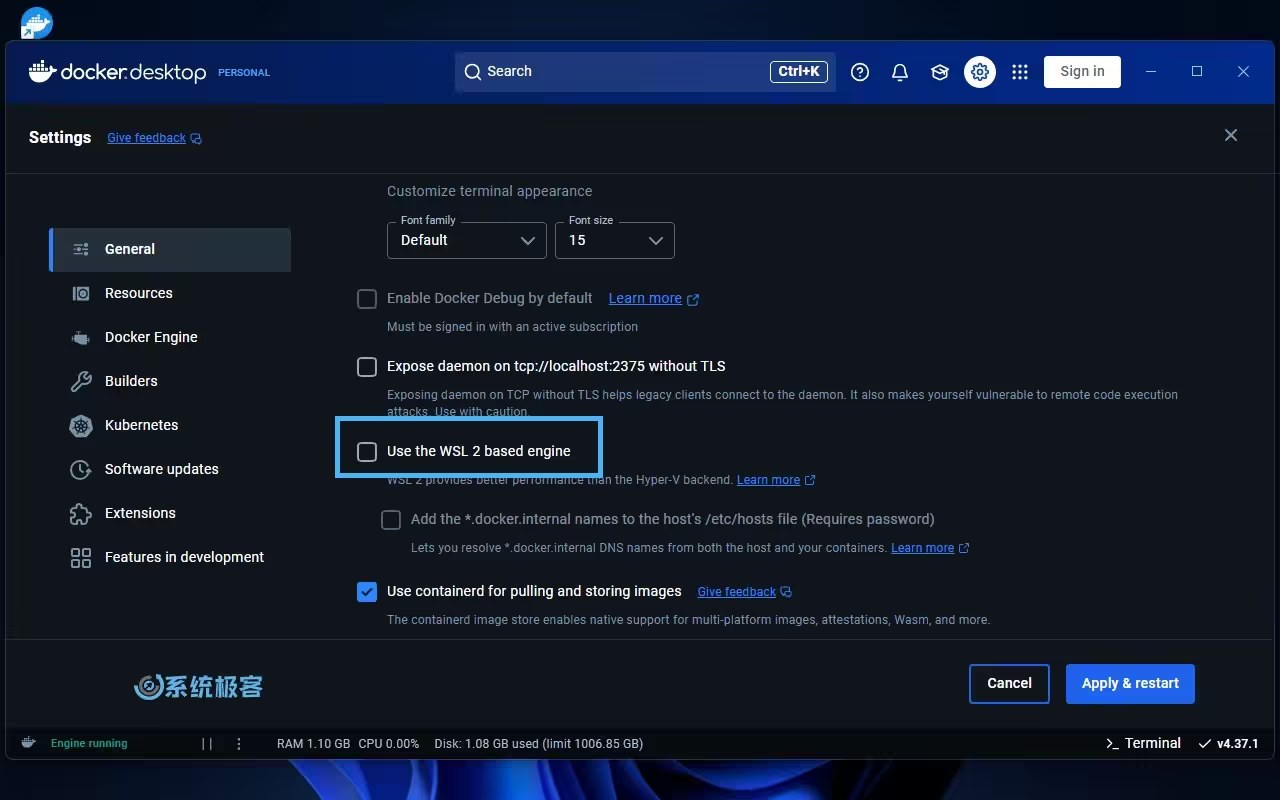 2在「General」常规选项卡中,勾选(使用)或取消勾选「Use the WSL 2 based engine」选项,以选择是否使用基于 WSL 2 的引擎。