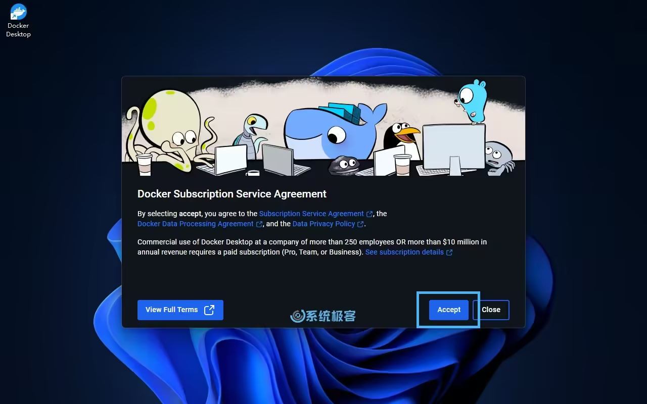 3启动 Docker Desktop,然后点击「Accept」接受 Docker 订阅服务协议。