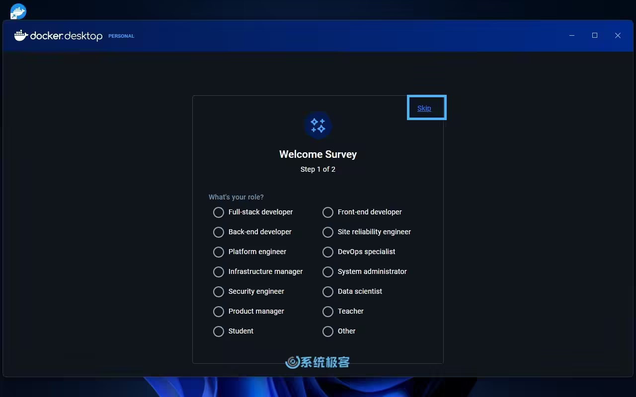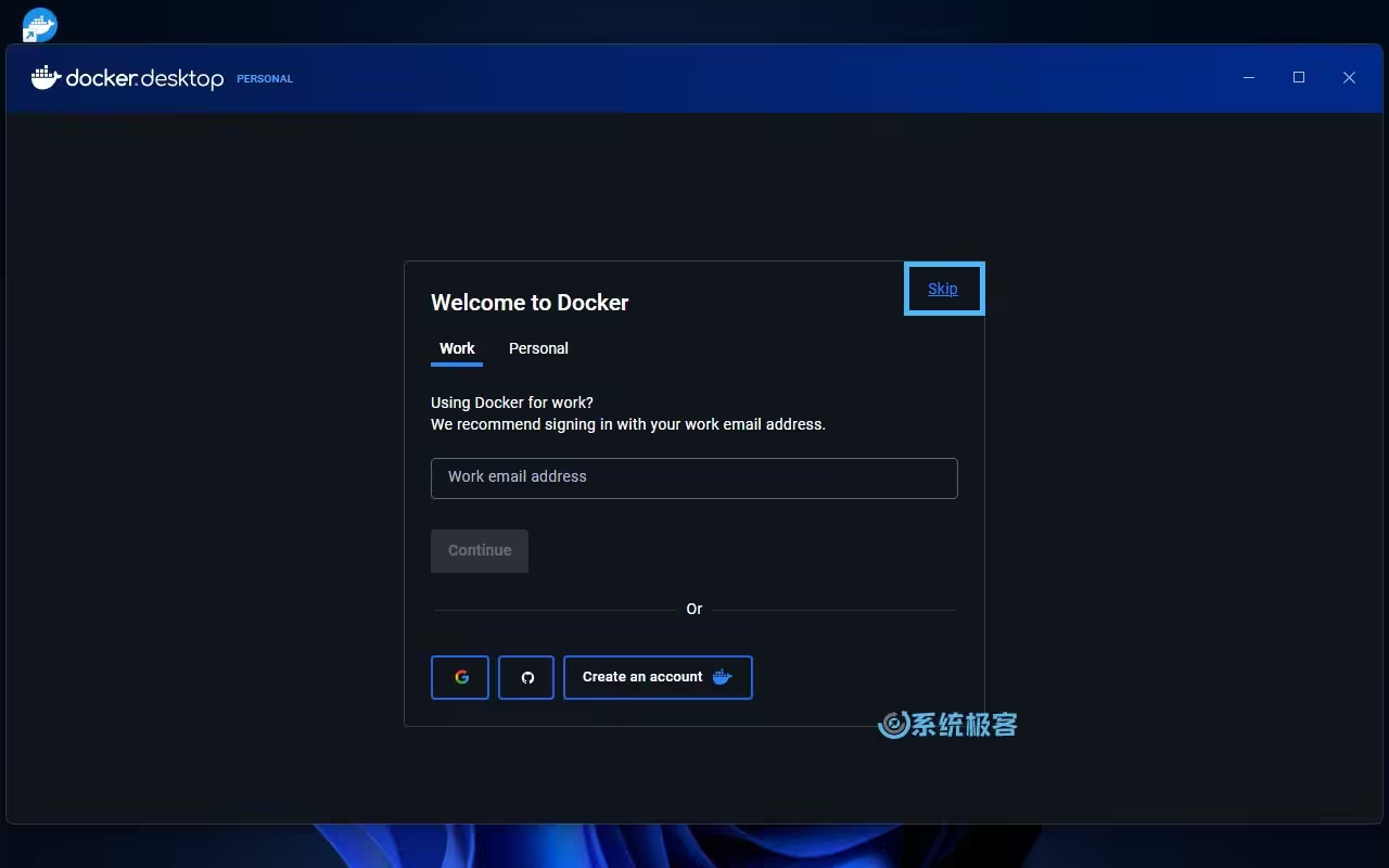 4你可以选择登录 Docker 账号,或者点击「Skip」跳过并直接进入 Docker Desktop 主界面。