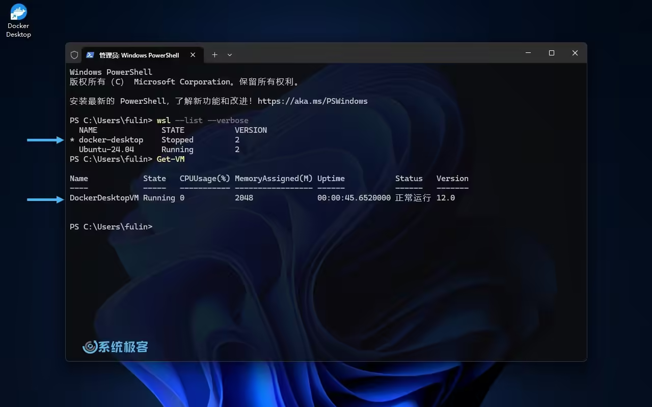 在使用 WSL 2 或 Hyper-V 后端时,分别会有一个名为 docker-desktop 的 Linux 子系统(WSL 2 默认创建)或名为DockerDesktopVM的虚拟机在后台运行。你可以使用以下命令进行查看:wsl --list --verbose # 查看 Linux 子系统的运行状态 Get-VM # 查看 Hyper-V 虚拟机的运行状态(PowerShell)