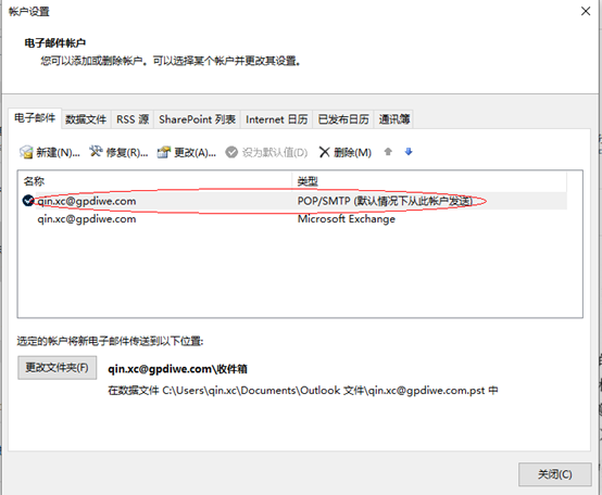 测试连接服务器通过后,这里有个新建的账户,然后设置为默认即可。原先那个账户里邮件保存到某个数据文件中后,就可以删除了。