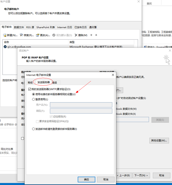其他设置里按下图点才行。发送服务——勾选我的发送服务器要求验证,点选使用与接收服务器相同设置。