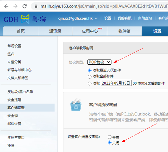 在左栏客户端设置那里,选择pop协议(这一步是否必须,不清楚)