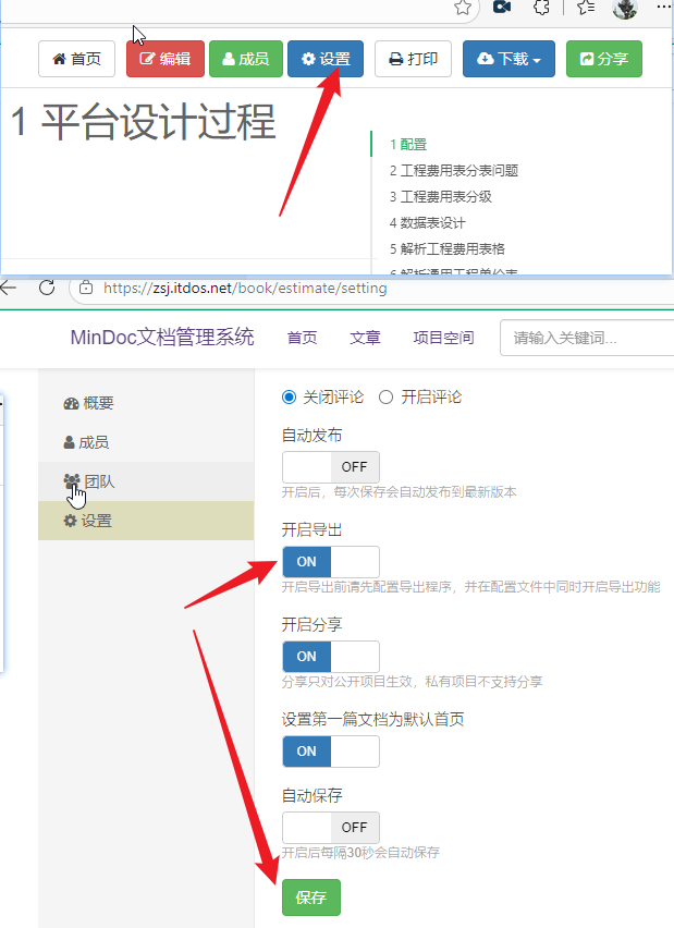自己的项目右上角设置里,打开导出功能后点击保存设置